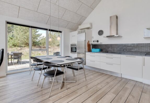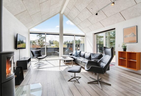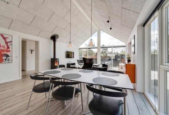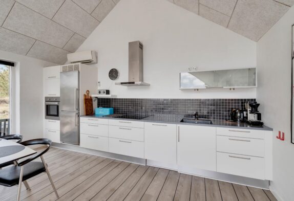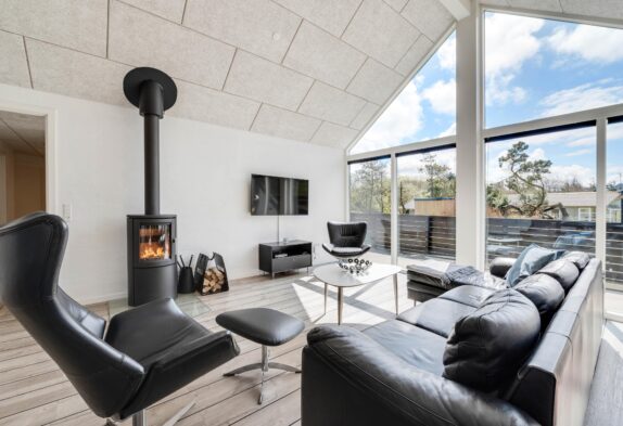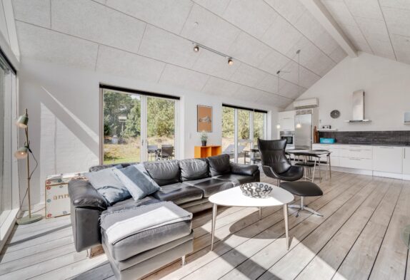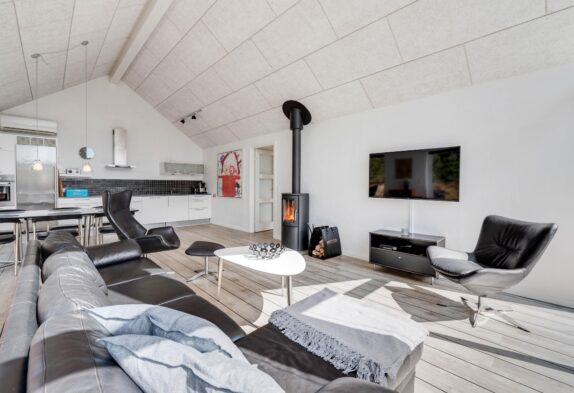 Her er et lækkert køkken med alt i hårde hvidevarer, som står i åben forbindelse med stuen. I opholdsrummet og køkkenet er der åbent til kip og masser af lysindfald fra det store sydvendte vinduesparti. Rummet har en rigtig god akustik takket være det specielle materiale, loftet er udført i. Stuen er superflot møbleret med komfortable møbler og har naturligvis brændeovn og fladskærm. Her er desuden en gratis internetforbindelse.