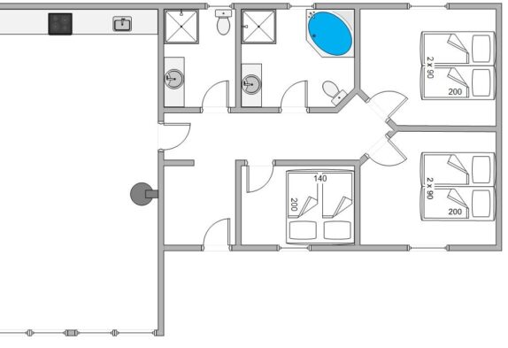 Sommerhuset har 2 flotte badeværelser med gulvvarme og bruser. Det store badeværelse har desuden et dejligt boblebad til 2 personer.