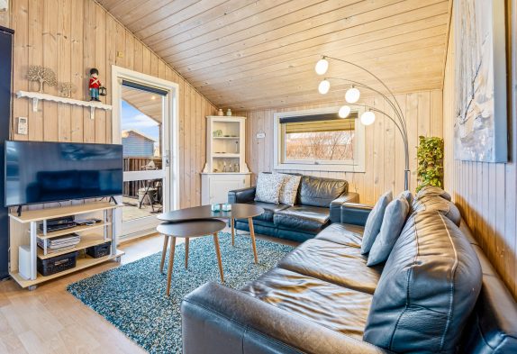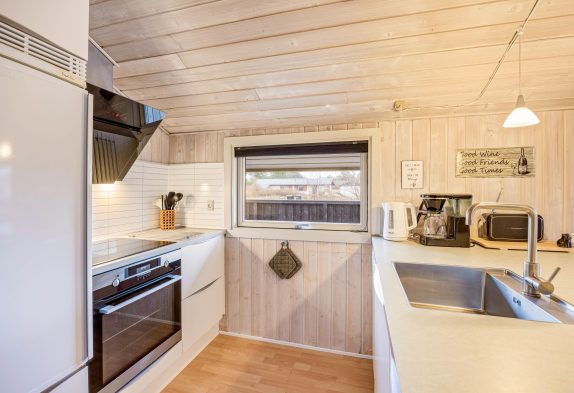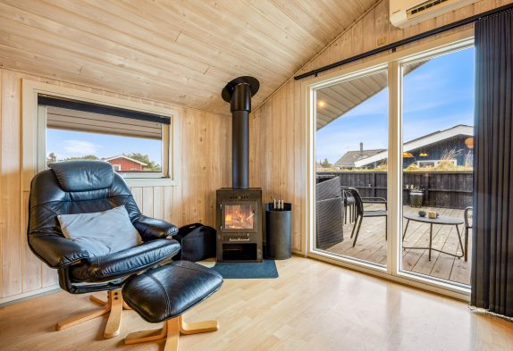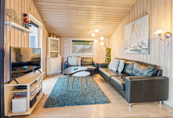 Med et dejligt hyggeligt sofahjørne med fjernsyn og brændeovn og et fint hvidt åbent køkken med spiseplads – alt sammen indrammet af trægulve og lyse trælofter og -vægge – er her et feriehus perfekt til at glemme hverdagsræset, falde til ro, og få tid til hygge med familiespil ved spisebordet eller en god bog i sofaen.