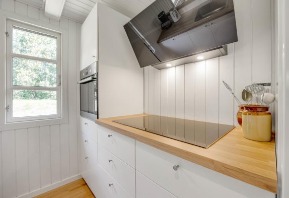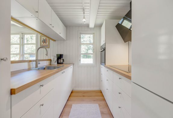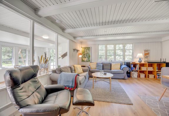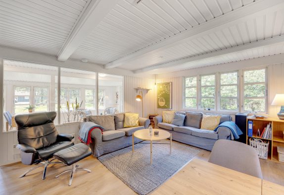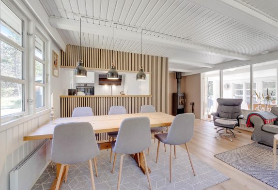 Køkkenet er praktisk indrettet med kig til den hyggelige stue, hvor brændeovnen og de gode siddemuligheder lægger op til mange timer med fællesskab omkring gode måltider, familiespil og snak. For energibesparende varme sørger husets varmepumpe. Især i den kolde årstid, når man ikke kan sidde på terrassen, men alligevel gerne vil nyde naturen og lyset, har man her mulighed for det i husets ”udestue”.