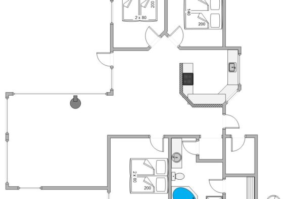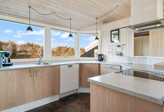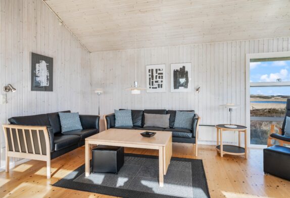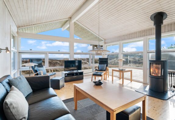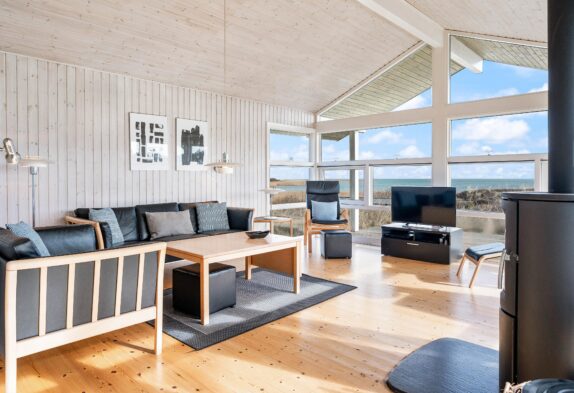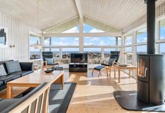 Indretningen i feriehuset er holdt i en lys og helt enkelt stil, som passer godt til det landskab, huset er en del af. Sommerhuset er indrettet med et stort opholdsrum, der ligger i åben forbindelse med køkkenet. I stuen kan I samles til filmhygge, imens I kan nyde varmen fra den knitrende brændeovn. Antallet af danske TV kanaler i huset er dog begrænset.