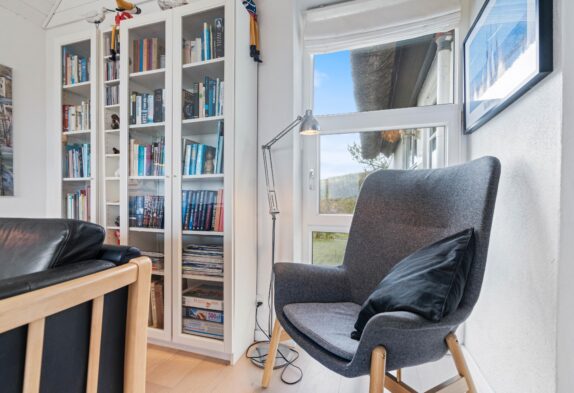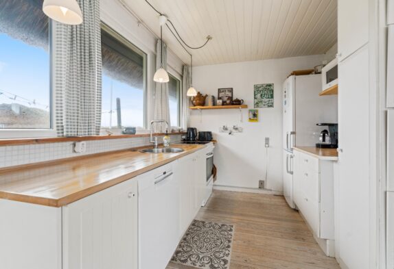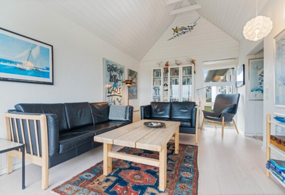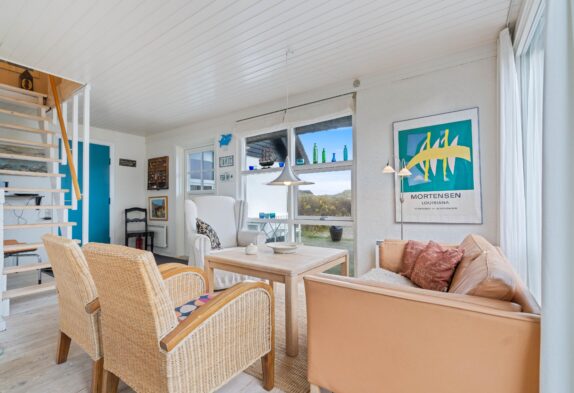 Feriehuset fremstår lyst og venligt. Og i den flotte rummelige stue med loft til kip og et stort vinduesparti kan I sidde og nyde udsigten over området eller hygge Jer med en god film foran fladskærms-tv’et.