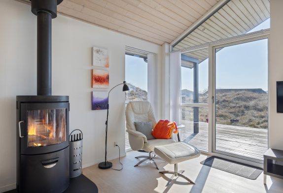 I stuen er der loft til kip og et stort vinduesparti, så her kan I nyde følelsen af rummelighed og udsigten til naturomgivelserne, mens den flotte brændeovn spreder en god varme og en hyggelig atmosfære. Huset er godt isoleret efter de nyeste standarder, og er også velegnet til vinterferien.