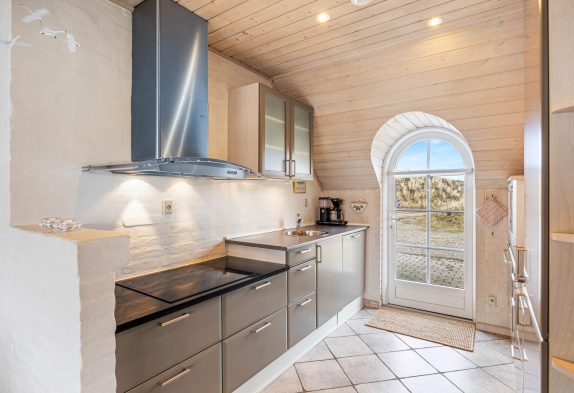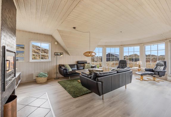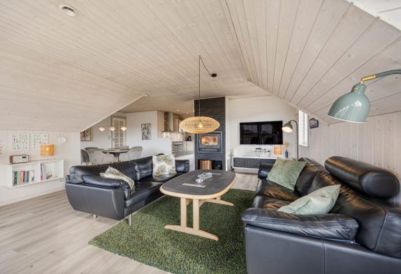 I den hyggelige stue, som er i åben forbindelse med køkkenet, sørger den indbyggede brændeovn for både hygge og varme. Og på det ene af feriehusets to badeværelser er der både sauna og spabad, så I kan forkæle jer selv med et par afslappende timer.