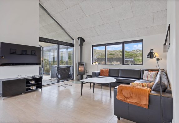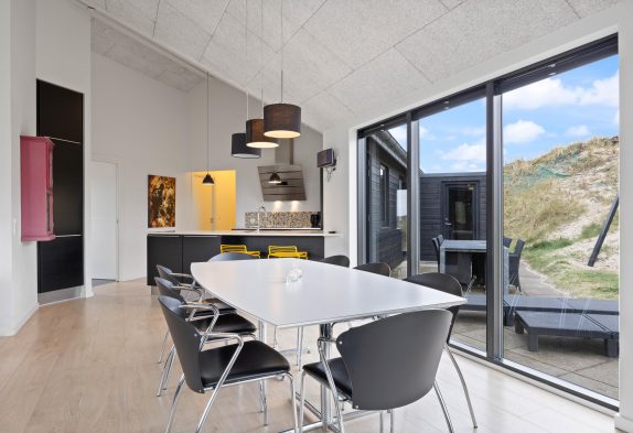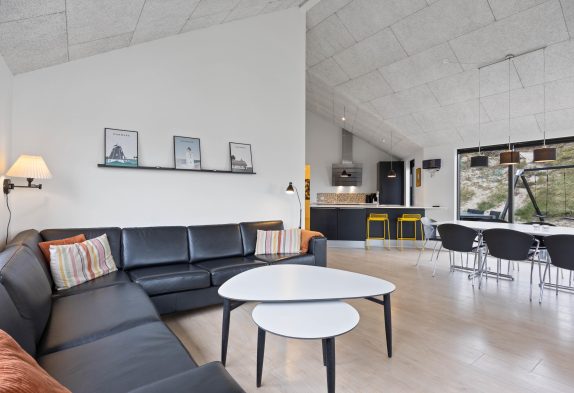 Feriehuset er lyst og lækkert med store vinduer med panoramaudsigt over den smukke natur, højt til loftet og velindrettet med enkle farver. Op mod syv feriegæster og deres to firebenede venner kan her få en skøn ferie, hvor der er plads til familien, store som små. Her er fire gode soveværelser, hvoraf to er med dobbeltseng, fladskærms-TV og med egne badeværelser, ét værelse har to enkeltsenge og det sidste værelse én enkeltseng. Alle værelser har trægulve med gulvvarme. Feriehuset byder også på et stort tredje badeværelse, hvor I for alvor kan koble af og komme ned i gear. Her venter spaens varme boblende vand og saunaen efter en gåtur ved det brusende Vesterhav. Her finder I også vaskemaskine og tørretumbler, som er praktisk og fleksibelt særligt for børnefamilien.
