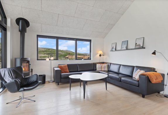 Hjerterummet er det store alrum, der forener køkken og stue. Køkkenet er pænt og funktionelt, og det står i åben forbindelse med den hyggelige stue. Rummet har en god akustik takket være den specielle loftsbeklædningen. På denne måde kan I tilbringe mange skønne timer sammen uden at lave det helt samme – bag en kage til kaffen i køkkenet, sæt jer til rette med et brætspil omkring spisebordet eller i sofaen til filmhygge. Rummet kan I varme op med den energibesparende varmepumpe, som skaber en behagelig temperatur og et godt indeklima – På de køligere dage kan I også tænde op i brændeovnen, som spreder hygge og varme – slap af foran brændeovnen og nyd den smukke udsigt gennem de store vinduer.