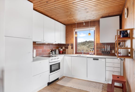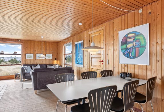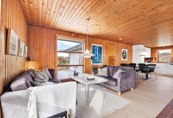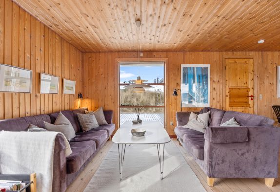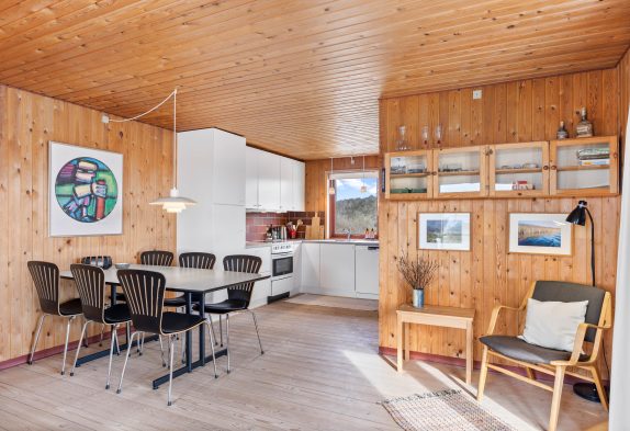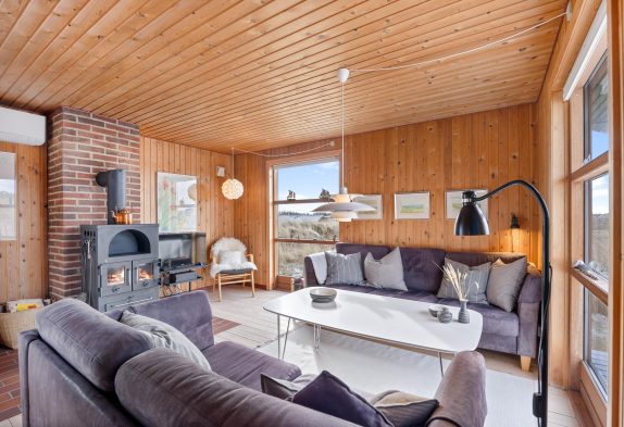 Feriehuset er personligt og hyggeligt indrettet, og de rustikke trævægge og lofter skaber en hyggelig og indbydende stemning. Her kan du sidde i sofaen i stuen og nyde varmen fra brændeovnen eller udsigten til området udenfor. I sommerhuset er der gratis trådløst internet, så du kan gå på nettet, når det passer dig. Desuden er der en Sonos internethøjtaler samt en Chromecast i feriehuset.