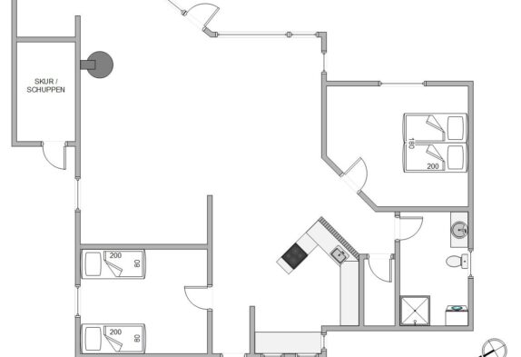 Sommerhusets fire sovepladser fordeler sig på to gode værelser. Det ene er indrettet med en dobbeltseng, mens det andet er indrettet med to enkeltsenge. På sommerhusets badeværelse er der gulvvarme, og der er desuden en vaskemaskine i feriehuset.