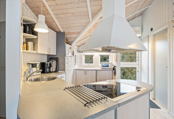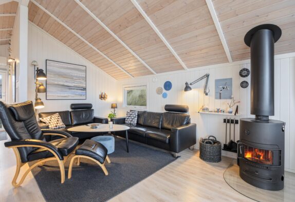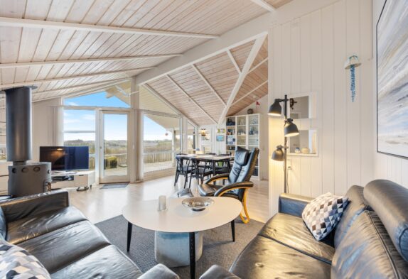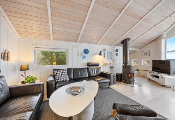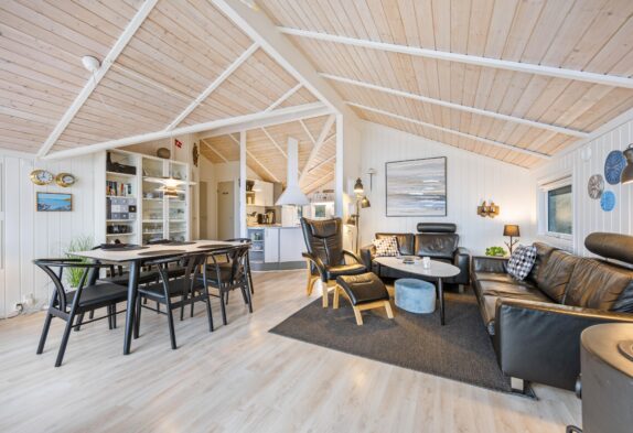 Overalt fremstår sommerhuset pænt og lyst i sin indretning. Sommerhusets centrale rum er det store opholdsrum, som ligger i åben forbindelse med køkkenet. Her er højt til loftet og en rar rummelig atmosfære. Også det store vinduesparti i enden af rummet, åbner rummet op og sørger for at lukke en masse lys ind i stuen.