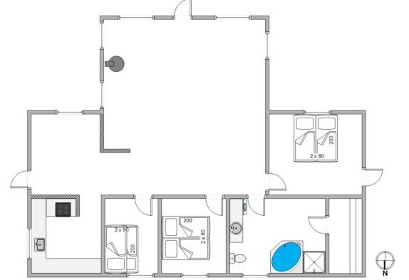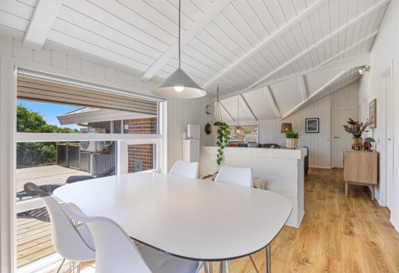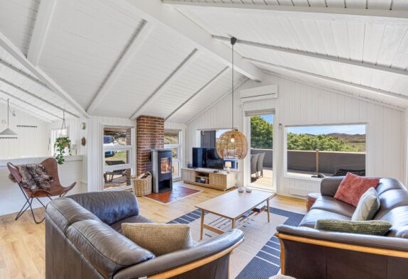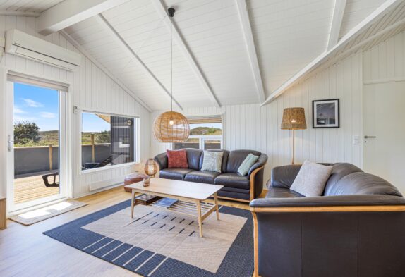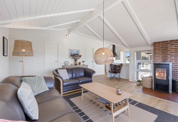 Feriehuset er hyggeligt indrettet med komfortable møbler og en dejlig brændeovn, der giver hygge og varme om vinteren. Her kan hele familien samles om et brætspil, en god film eller bare slappe af efter en lang tur langs stranden. Sommerhuset har plads til 6 personer og 2 hunde. Her er gratis internet, sauna, spabad og en energibesparende varmepumpe.