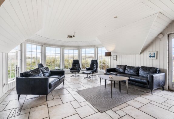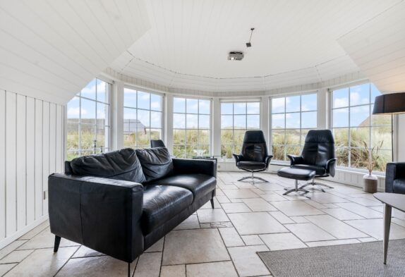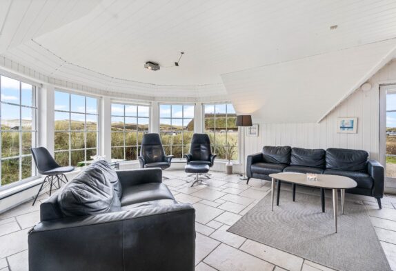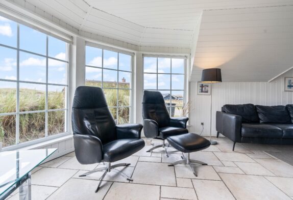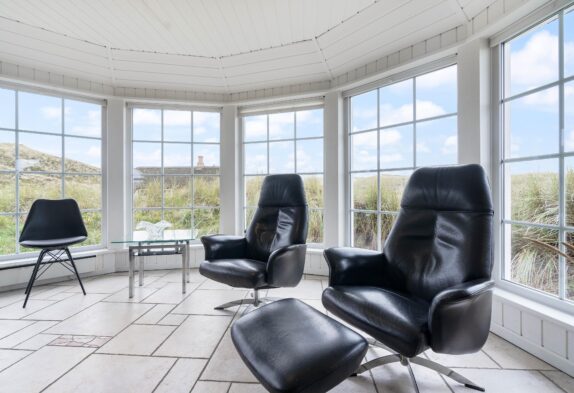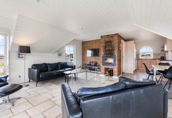 Hjerterummet er det store opholdsrum, hvor spisestuen binder stue og køkken sammen. Det fine vinkelkøkken er veludstyrer og rummer både en fryser (60L), mikroovn og opvaskemaskine. Opholdsrummet har klassiske trælofter og murstensvægge, der skaber et rustikt men varmt udtryk. Mens brændeovnen knitrer, kan I samles til fælles hygge i sofaen eller nyde den smukke udsigt udover klitterne gennem de store vinduer. Både opholdsrummet, badeværelser og entréen har et rengøringsvenligt klinkegulv, mens der i entréen er en vaskesølje med både vaskemaskine og tørretumbler til rådighed.