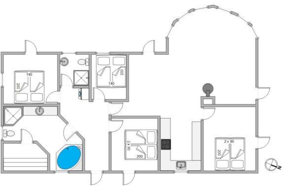 Der er 4 soveværelser i sommerhuset, alle med trægulve og dobbeltsenge. Begge badeværelser er med gulvvarme og bruseniche, mens der på det store badeværelse endvidere er en indmuret hjørnespa samt en sauna. Her kan I for alvor koble af fra hverdagen.
