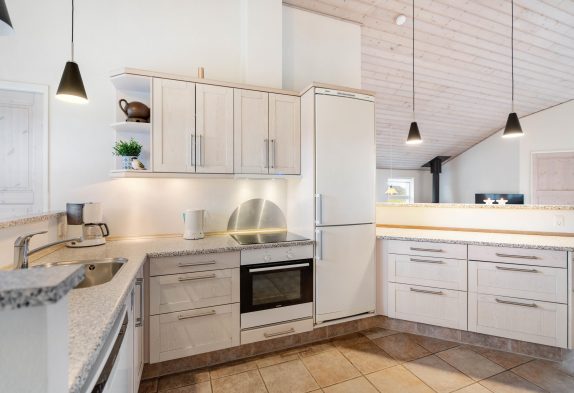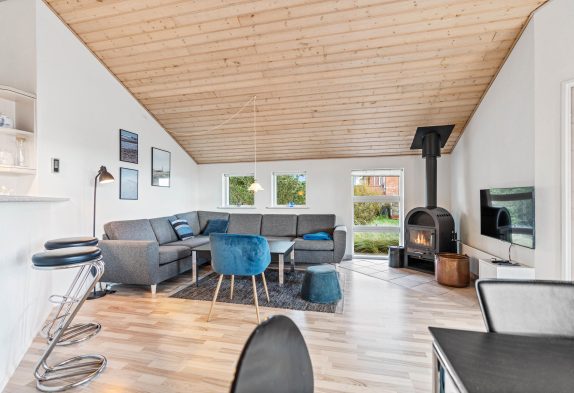 I stuen er der brændeovn, som er perfekt, når vejret begynder at blive koldere. Tænd op i brændeovnen og hop under et dejligt, varmt tæppe – måske med en god bog og en kop kaffe – og nyd roen og den hyggelige atmosfære, som varmen og den knitrende lyd fra brændeovnen sender rundt i sommerhuset.