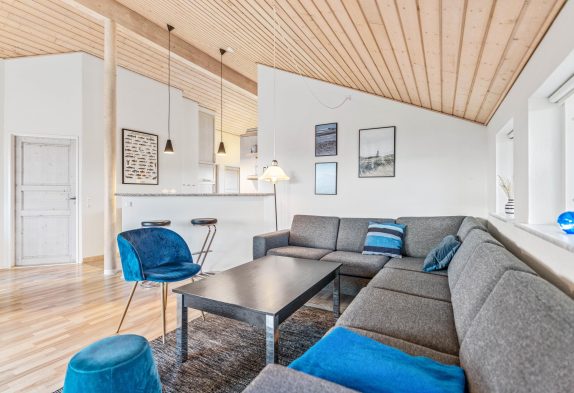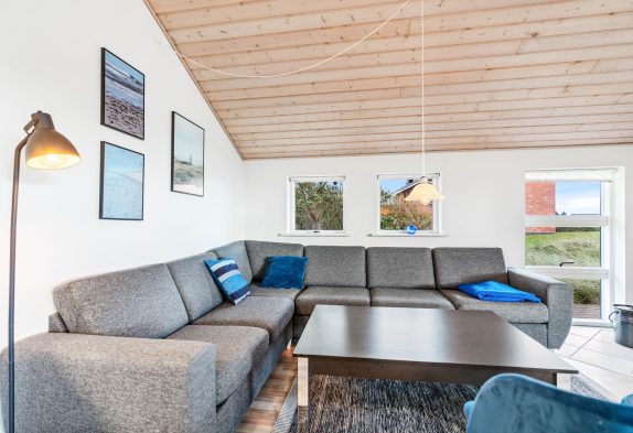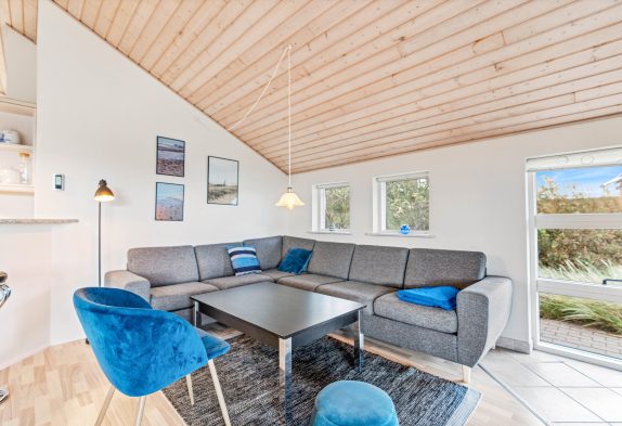 I alrummet er der højt til loftet, hvilket giver rummet en let og rummelig atmosfære. Spisepladsen er placeret ved et stort vinduesparti med en dejlig udsigt til klitgrunden. De store vinduer inviterer både lyset og omgivelserne indenfor i indretningen. Sommerhuset er desuden indrettet med 4 gode soverum og et stort og lyst badeværelse, der har både spabad og sauna. Sommerhuset byder derfor på den komfort, der hører et moderne feriehus til.