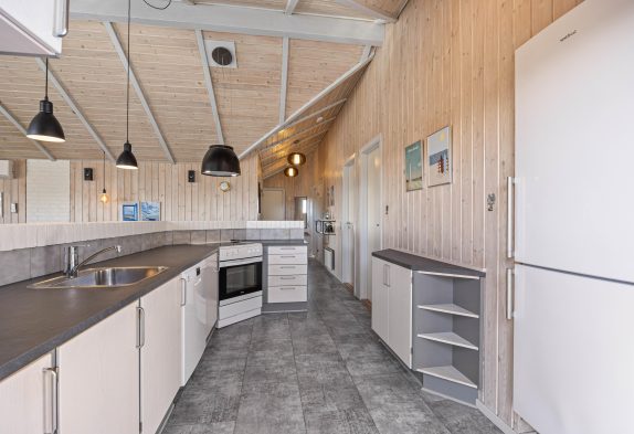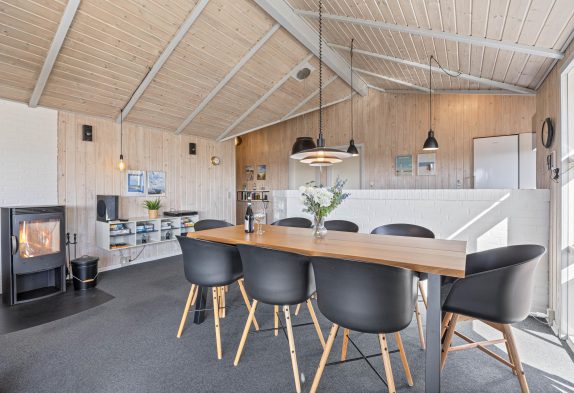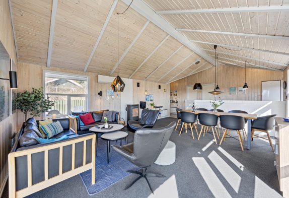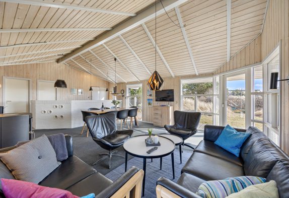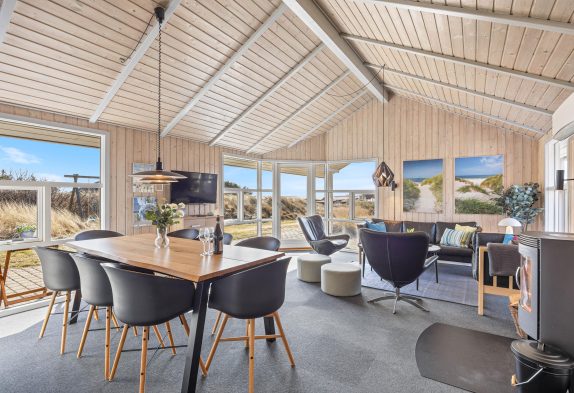 Indenfor er indretningen af det 98 m2 store feriehus holdt enkelt og lyst. Den store stue, der har loft til kip, ligger i åben forbindelse med feriehusets køkken. De primære materialer i indretning er holdt i træ i lette, lyse farver. Det skaber en hyggelig og indbydende indretning med en god sommerhusånd.