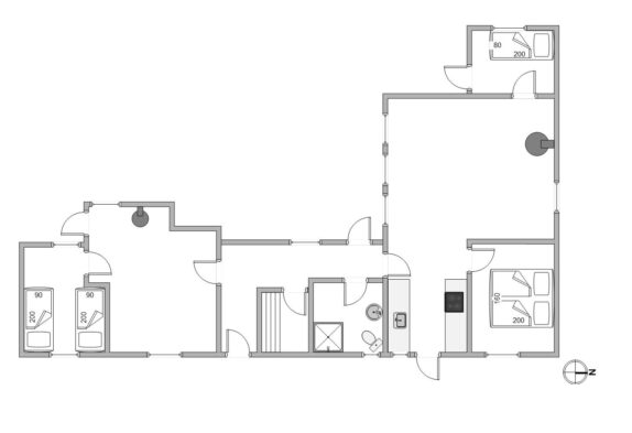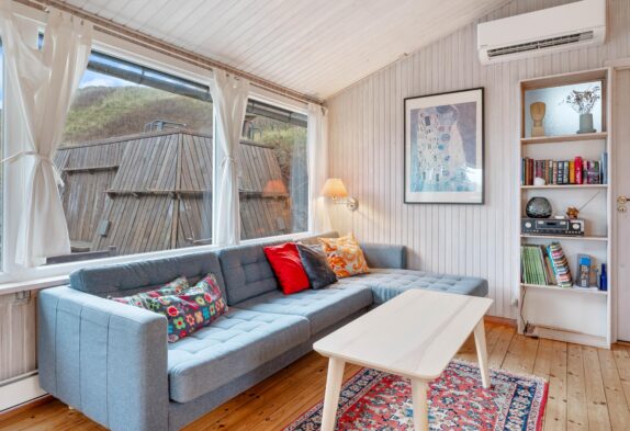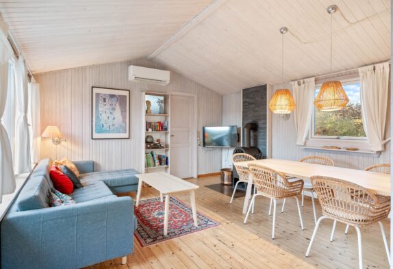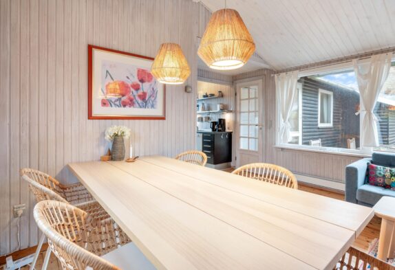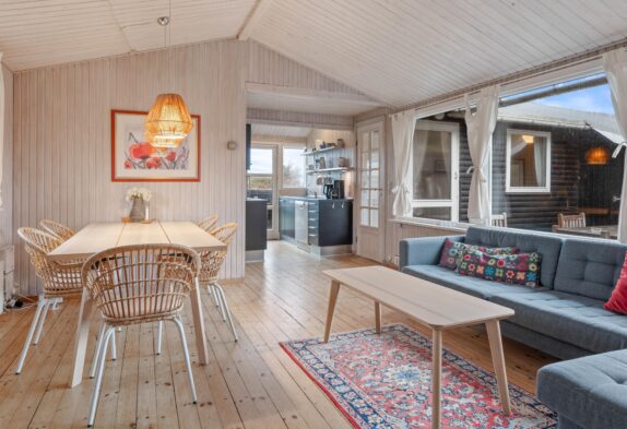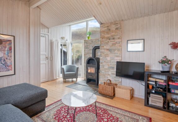 Huset er godt indrettet med stue og soveafdeling i hver sin ende af huset. Dette giver mulighed for at nogen kan hygge sig med TV eller spil, mens andre kan læse en bog og nyde roen foran brændeovnen. Der er både nyt køkken og nyt bad fra 2012. Alle rum er indrettet særdeles indbydende. Køkkenet indeholder bl.a. fryser på 40 L og opvaskemaskine. Der er gratis trådløst internet samt TV og brændeovn i begge stuer. Badeværelset er med bruseniche og indgang til sauna. Huset har i alt er 3 soveværelser – 1 med en dobbeltseng, 1 med to enkeltsenge og 1 værelse med en enkeltseng.