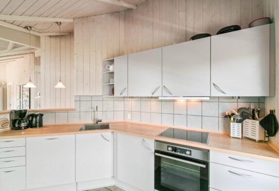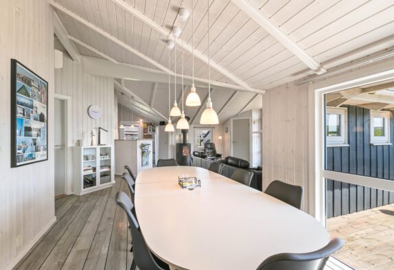 Køkkenalrummet er hjertet af dette sommerhus. Her finder I både det funktionelle køkken, med mikroovn og opvaskemaskine. Samt den store brændeovn som sørger for en hyggelig sommerhusstemning og en god varme der holder jeres forbrug lidt nede. Derudover kan I nyde det dejlige sofaområde, med en god film eller en lille lur.
