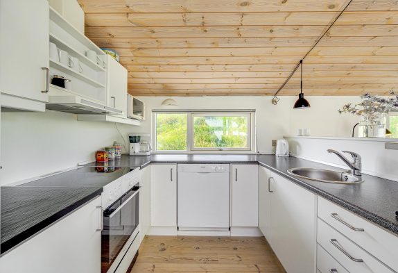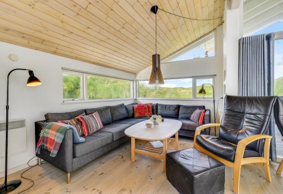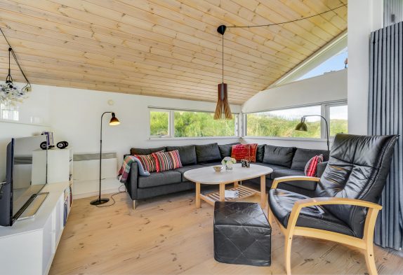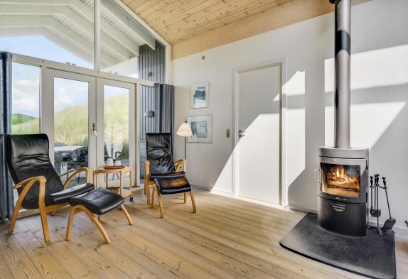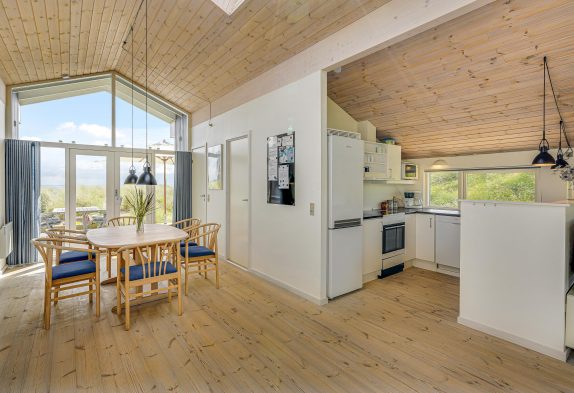 Husets centrale opholdsrum er pænt indrettet med gode og komfortable møbler, brændeovn og fladskærms-TV. Der er trægulve overalt. Veludstyret køkken med bl.a. opvaskemaskine, der er i åben forbindelse med stue og spisestue. Hvad enten du opholder dig i spiseafdelingen eller slapper af i sofaen, kan du nyde den smukke udsigt over området.