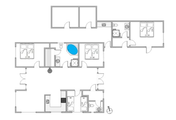 Det flotte, rummelige sommerhus er lyst og indbydende og har masser af lysindfald fra de store vinduespartier mod øst og vest samt ovenlysvinduet i opholdsstuen. Huset er indrettet med 3 fine soveværelser i hovedhuset. Stort badeværelse med boblebad og sauna, samt et mindre gæstetoilet. I husets flotte anneks er der yderligere et dobbeltværelse samt badeværelse med gulvvarme, altså i alt 8 sovepladser, 2 badeværelser og et gæstetoilet.