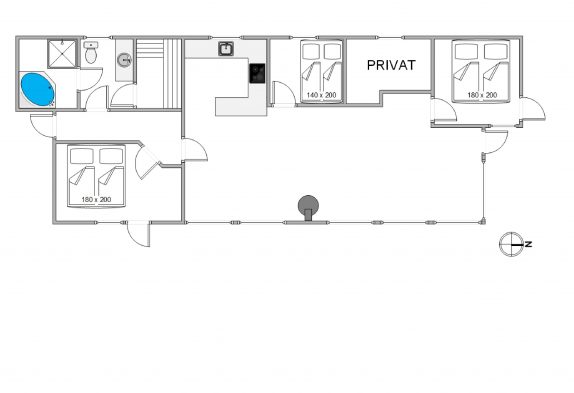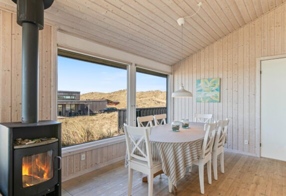 Køkken og stue er slået sammen til ét stort opholdsrum med brændeovnen i centrum, og både fra sofaen og spisebordet kan I nyde den smukke havudsigt, mens I slapper af med en god bog eller spiser et lækkert feriemåltid sammen. Køkkenet er desuden fuldt udstyret med alle nødvendigheder, inklusiv en opvaskemaskine, der gør opvasken hurtig og nem, så I kan bruge mere tid på at nyde jeres ferie. Badeværelset er udstyret med gulvvarme for ekstra komfort samt en indbydende tømmespa og sauna.