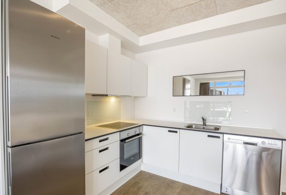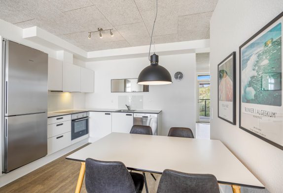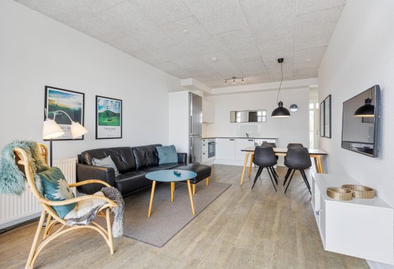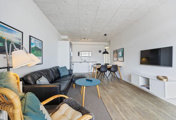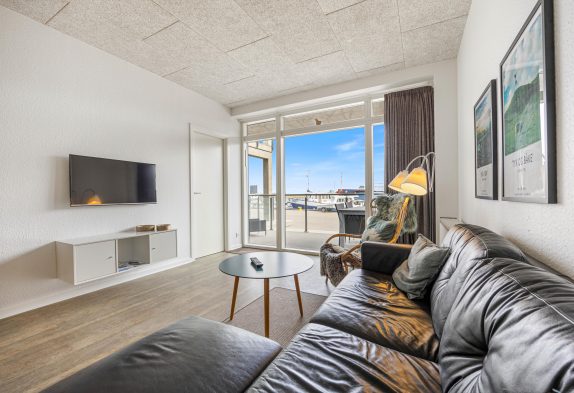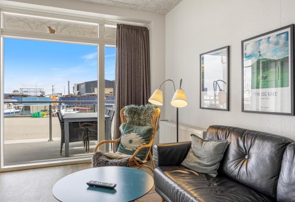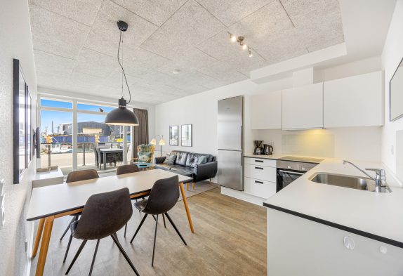 Solen lyser lejligheden op gennem de store vinduesfronter. Her er køkken og stue slået sammen til et hyggeligt fællesrum, som fungerer som ferielejlighedens hjerte, og som med garanti kommer til at danne rammerne om en masse gode ferieminder. Herfra har I også en skøn udsigt ud over den lille fjordhavn.