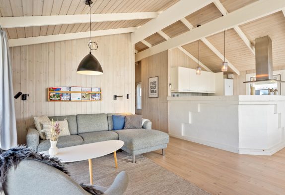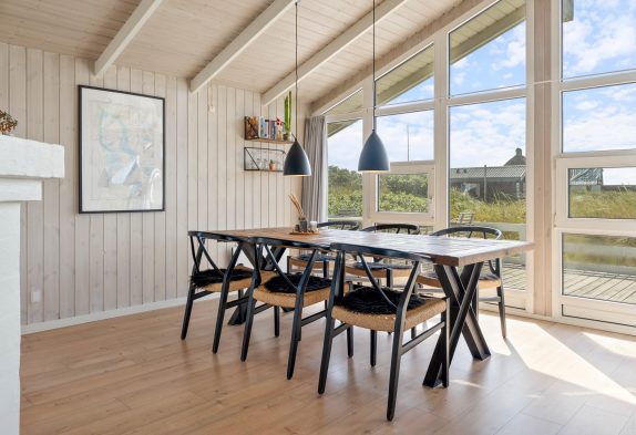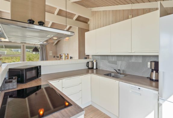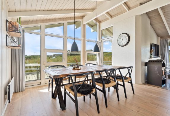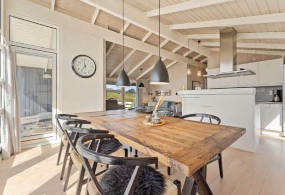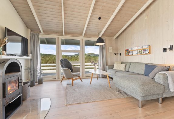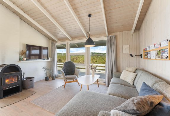 Opholdsrummet med stue og køkkenalrum i ét er feriehusets hjerte, og den klassiske brændeovn sørger for både varme og hyggelig feriestemning med sine knitrende flammer. De store vinduespartier inviterer det smukke klitlandskab indenfor og giver et skønt lysindfald.