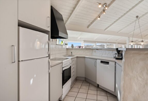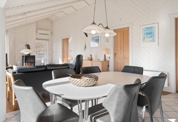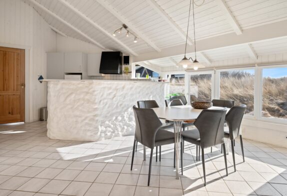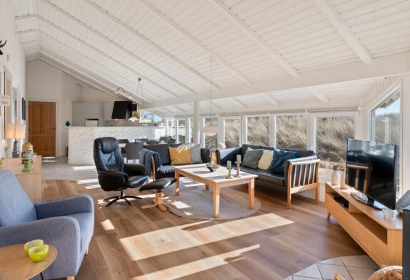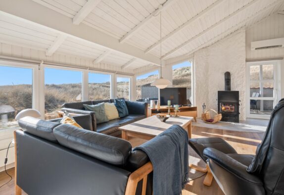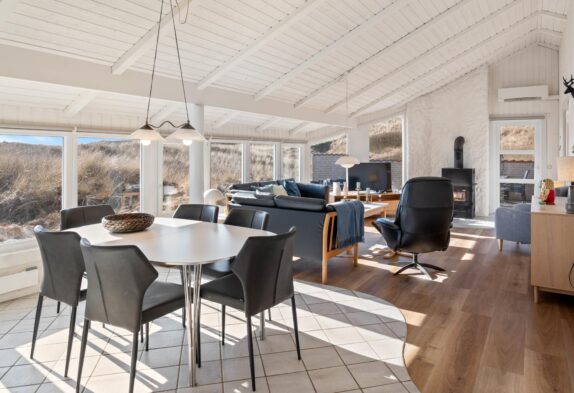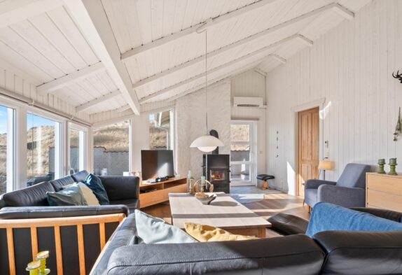 I den hyggelige stue kan I sammen hygge Jer foran tv’et eller omkring et spil. Og da der her er et stortvinduesparti, som også sørger for et godt lysindfald, kan I samtidig nyde udsigten over naturgrunden. I den ene ende luner brændeovnen, og i den anden ende er der indrettet et dejligt, åbent køkken, hvor I kan tilberede feriens måltider.