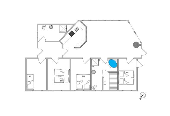 Feriehuset er dejligt rummeligt og godt indrettet, så der endda er plads til to familier. De to badeværelser har god plads, og på den ene er der oveni købet en sauna og et spabad, så I rigtig kan slappe af.