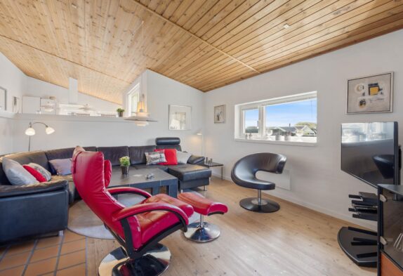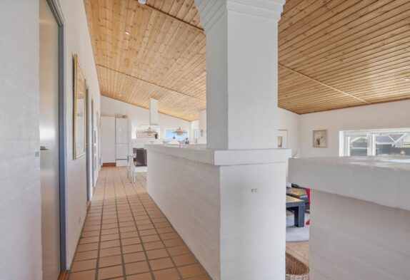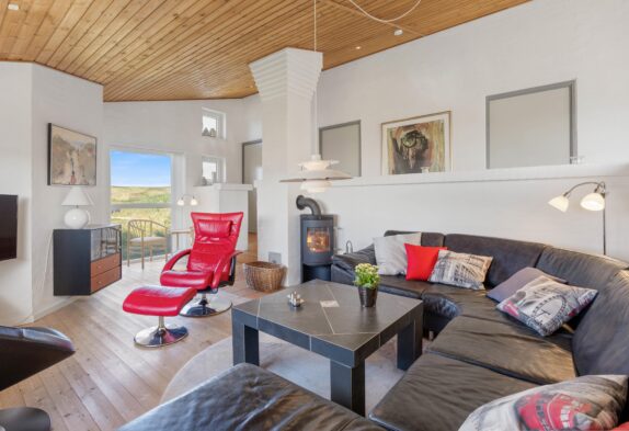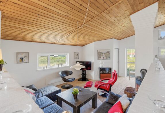 Stuen finder du i forskudt plan, hvilket har en god effekt og nærmest gør den til en rigtig hyggekrog, hvor der slappes af med en god film og ild i brændeovnen.