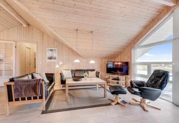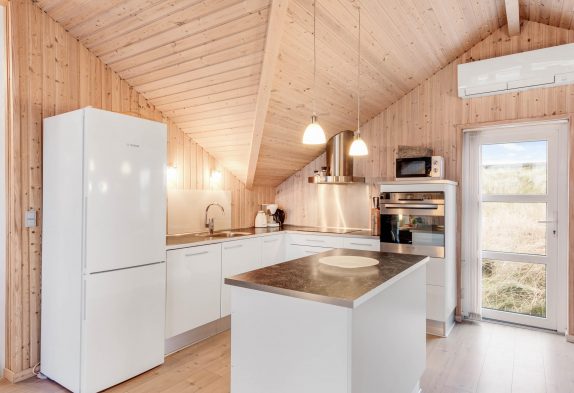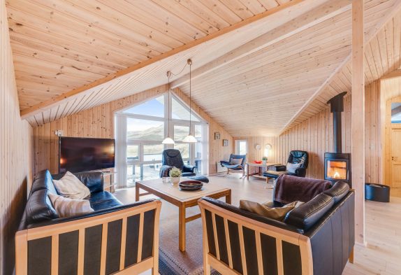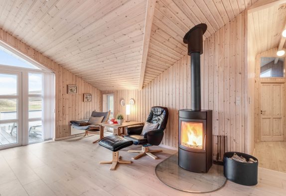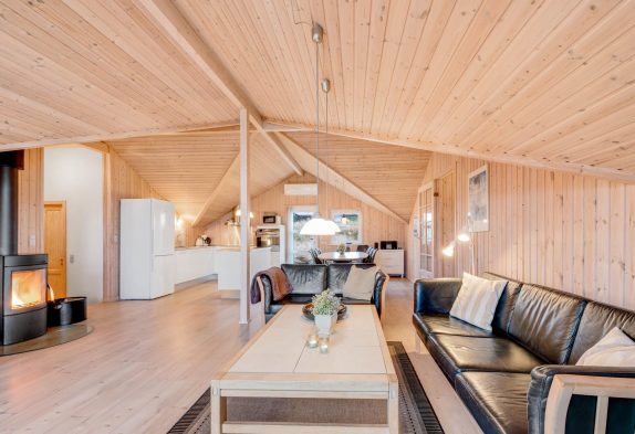 Samlingspunktet i sommerhuset er opholdsrummet, som ligger i åben forbindelse med det veludstyrede køkken. Stuen indbyder til mange hyggelige stunder i familiens selskab, mens brændeovnen sørger for varme på en blæsende efterårsdag. I kan desuden også benytte jer af varmepumpen, som hjælper med at holde temperaturen i rummet behagelig.