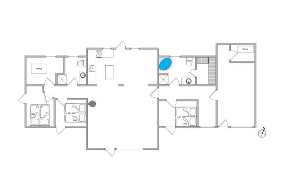 De 6 sovepladser er fordelt på 3 gode værelser med dobbeltsenge, hvor I kan få en god nats søvn og samle energi til morgendagens aktiviteter. Sommerhuset har 2 badeværelser, så der ikke opstår kø om morgenen.