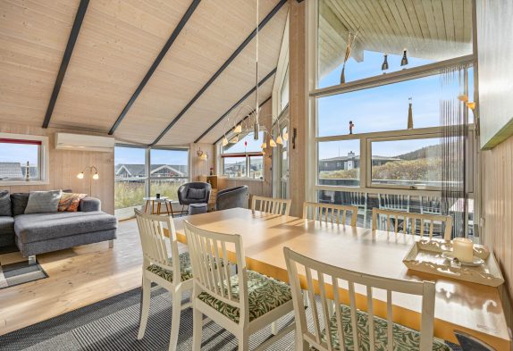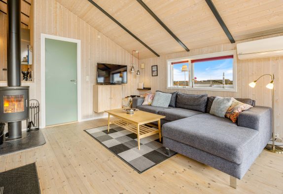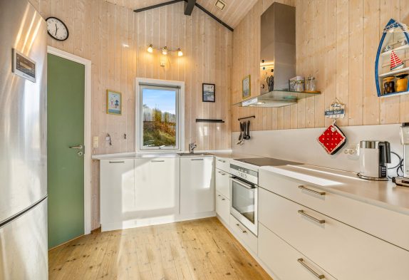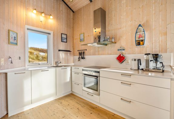 Køkkenet er praktisk og velindrettet. Her finder I bla. en fryser på 86 l, en Air fryer samt en opvaskemaskine. Stuen vender mod syd og har et smukt lysindfald fra de store vinduespartier. Møblerne og hele interiøret er nøje afstemt. Den flotte brændeovn giver både hygge og varme. Der er gratis trådløst internet i sommerhuset.