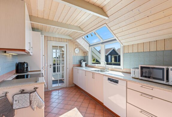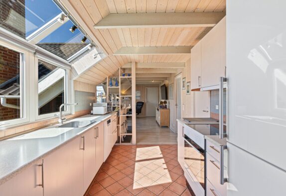 Køkkenet, hvor vinduerne går i kip er udstyret med alt, hvad I skulle få brug for. Gulvet er belagt med klinker og der er endda gulvvarme, så fødderne også her holder sig dejligt varme.