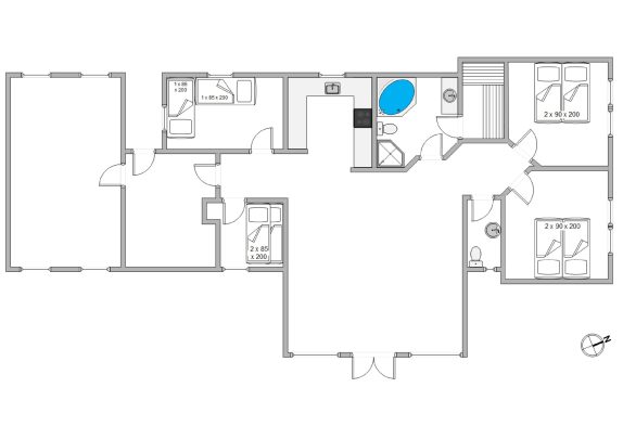 Derudover er der både et badeværelse og et gæstetoilet, så I undgår kø om morgenen. På badeværelset er der desuden både sauna og spabad, som medvirker til en ekstra afslappende ferie. I skal være opmærksomme på, at i februar 2026 bliver spabadet fjernet. Dernæst er der 4 soveværelser med henholdsvis 2 dobbeltsenge og 2 enkeltsenge samt 1 køjeseng, som sikrer jer en god nats søvn, så I er friske til feriens oplevelser.