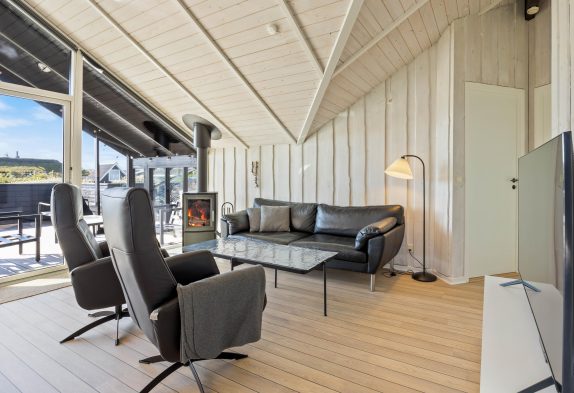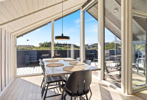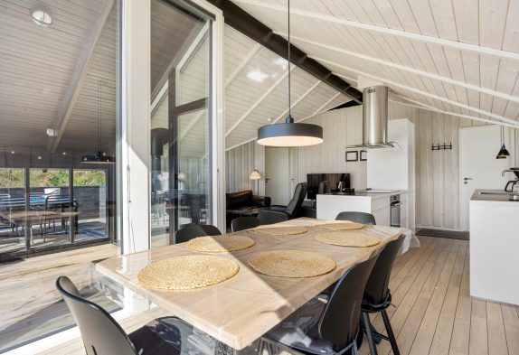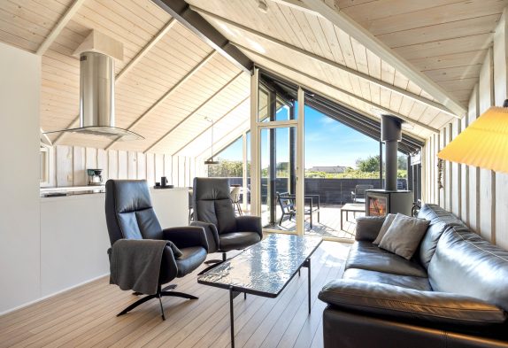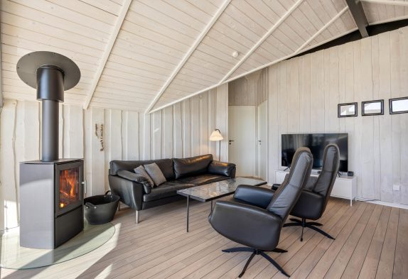 Spisepladsen er placeret ved de store vinduer, så I har mulighed for at nyde den dejlige udsigt over en dejlig middag med familien. På kolde og blæsende dage kan I tænde op i brændeovnen og nyde varmen og en kop kaffe i sofaen.