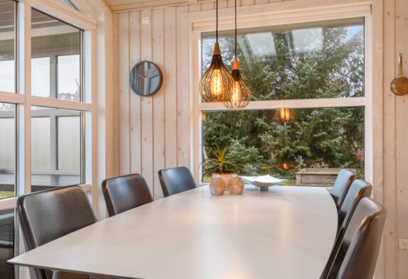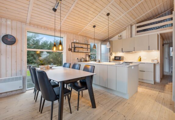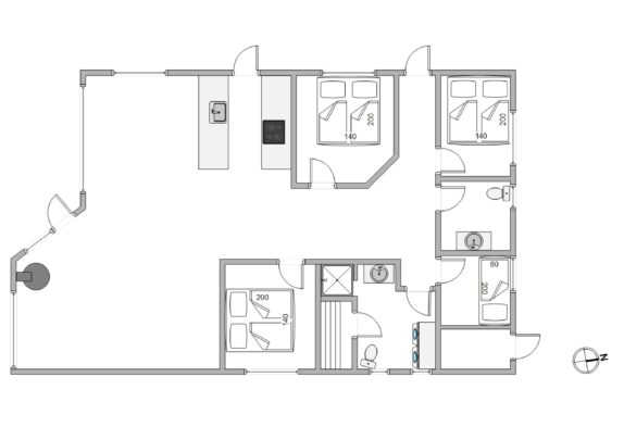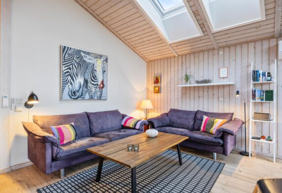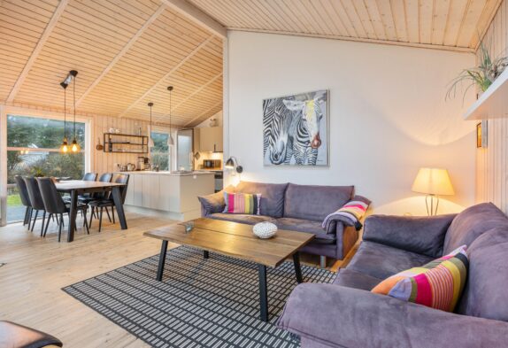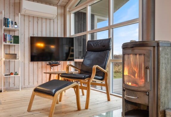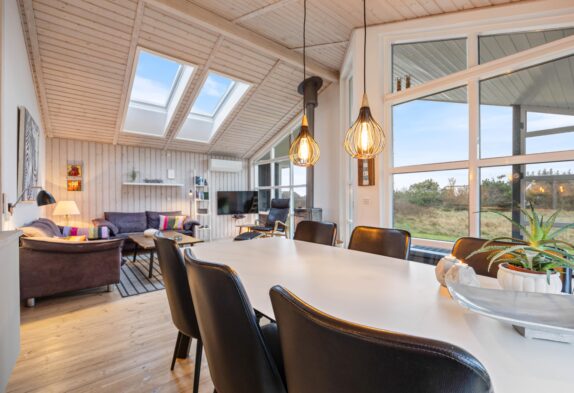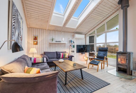 Sommerhuset er indrettet med 4 soveværelser med plads til 6 personer i alt samt et stort badeværelse med sauna og gulvvarme og et gæstetoilet med gulvarme. I stuen er der åbent til kip og her er masser af lysindfald gennem ovenlysvinduerne og det store vinduesparti mod syd. Her kan I slappe af i sofaen med en god bog i hånden, imens I nyder varmen fra brændeovnen. Køkkenet er praktisk indrettet og her er alt man behøver i den daglige husholdning.