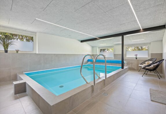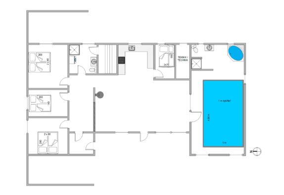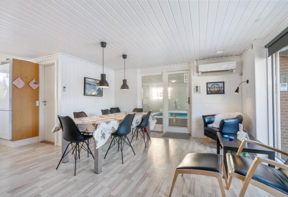 Dette sommerhus er særdeles velegnet til ferie hele året igennem, for her er swimmingpool, spa og sauna og Vesterhavet er kun en rask spadseretur væk. Der er 4 soveværelser, 3 af værelserne har hver en dobbeltseng og det sidste har køjesenge, hvilket børnene helt sikkert ville elske. Badeværelset er indrettet med bruseniche, sauna og gulvvarme og her finder I også husets vaskemaskine, tørretumbler, så I ikke skal være bekymrede for at løbe tør for rent tøj. Dertil er der også et badeværelsesafsnit i poolafdelingen, hvor der er en hjørnespa, bruseniche samt gulvvarme.