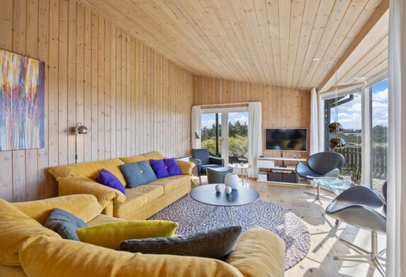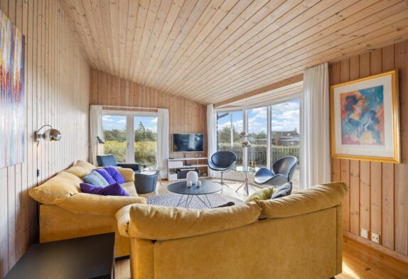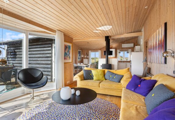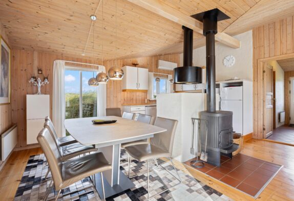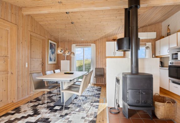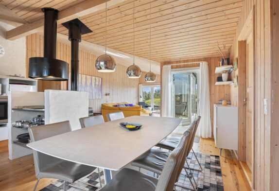 Sommerhusets hjerte er det store køkken- alrum, som er placeret i husets midte. Indretningen er flot og lys. Her kan I sidde i stuen og nyde den flotte udsigt til lanskabet udenfor.