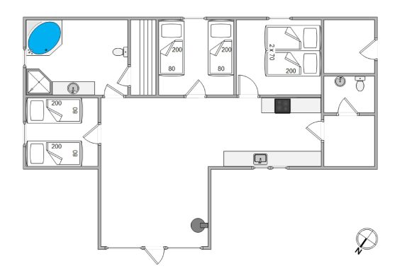 Huset har 3 gode soverum. 1 af værelserne er indrettet med en dobbeltseng og 2 med to enkeltsenge hver. Huset har et superdejligt stort badeværelse med spa og indgang til en dejlig sauna. Huset har desuden også et lille gæstetoilet, og i huset står en kondicykel også til rådighed. På både det store badeværelse og gæstetoilettet er der også gulvvarme, så dine fødder altid holdes dejlig lune.