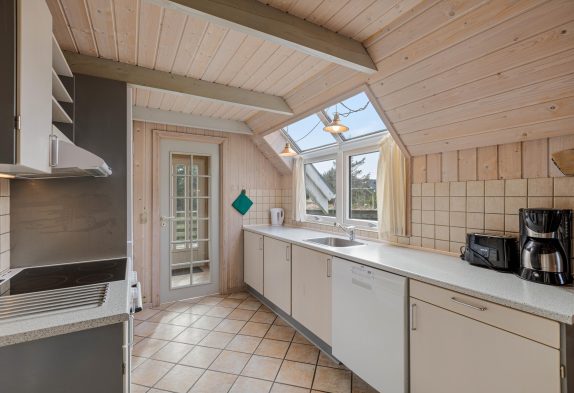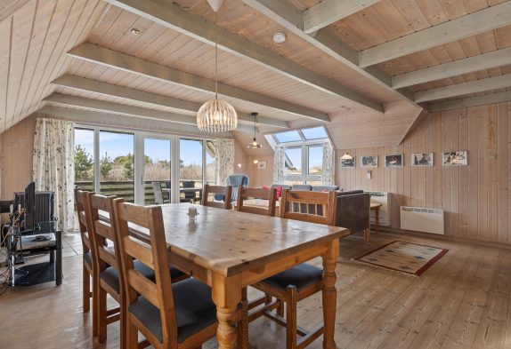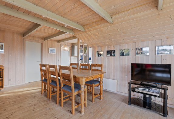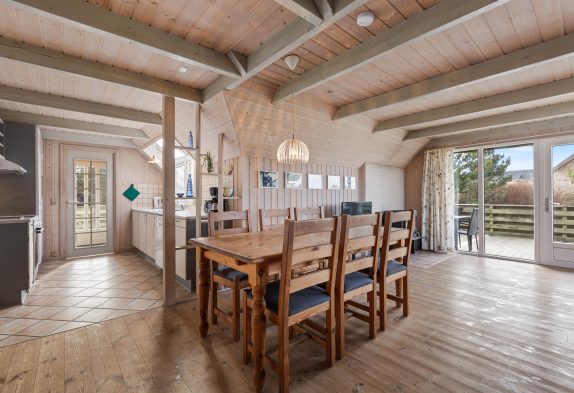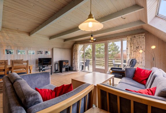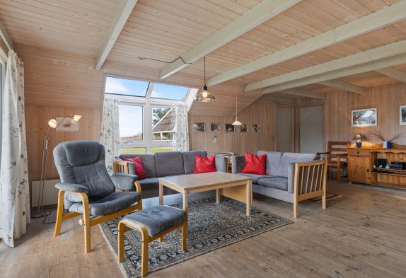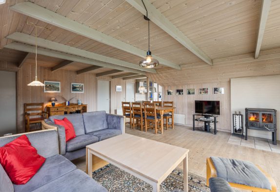 Den rummelige stue har et godt lysindfald fra glaspartiet mod terrassen og er kombineret med køkkenet. I det lyse køkken kan I samles om madlavningen og lade opvaskemaskinen klare det beskidte service. Stuen er indrettet med gode møbler, trægulv og en dejlig brændeovn. Her kan I samles hele familien med popcorn og dyner i sofaen, i mens I kan se en hyggelig familiefilm og høre brændeovnens knitren i baggrunden. Det er også muligt at opvarme huset med den energibesparende luft til luft varmepumpe.