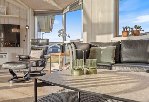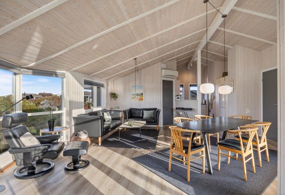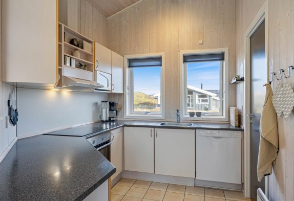 Køkken og stue ligger i forlængelse af hinanden, og de store vinduespartier gør rummet endnu mere åbent og giver jer udsigt til det smukke klitlandskab. Brændeovnen sørger for varme og hyggelig atmosfære året rundt.