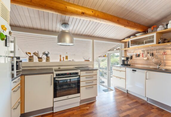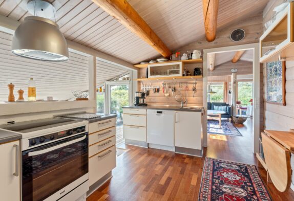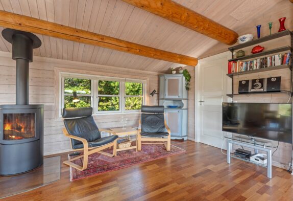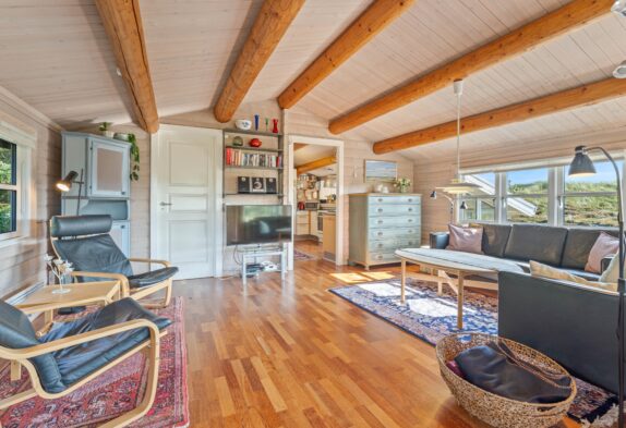 Dejligt, charmerende og velindrettet feriehus med dejlig fredelig beliggenhed på en kuperet naturgrund i et attraktivt område. Huset er omgivet af flere terrasser, – en delvist overdækket og med en flot udsigt mod syd. Indretningen er i en flot, personlig stil, hvor tingene passer godt sammen.