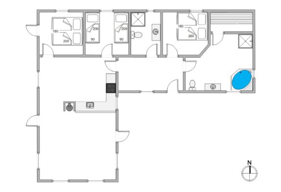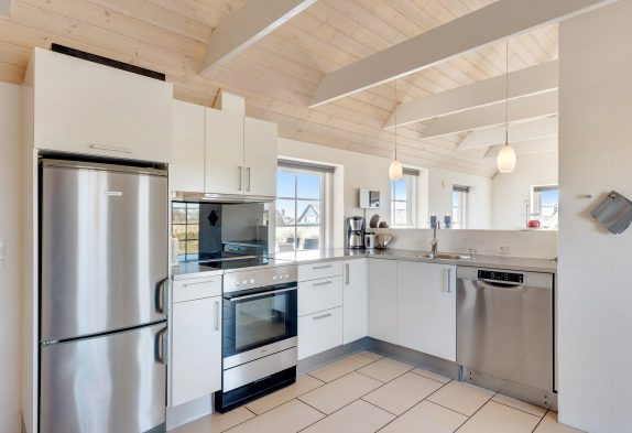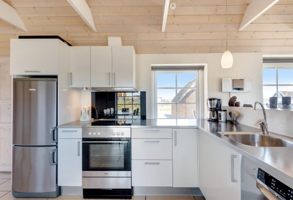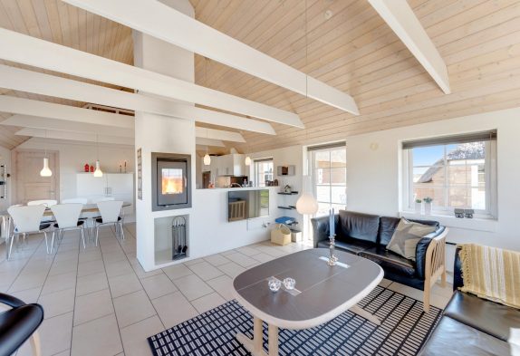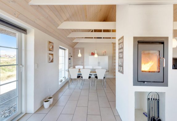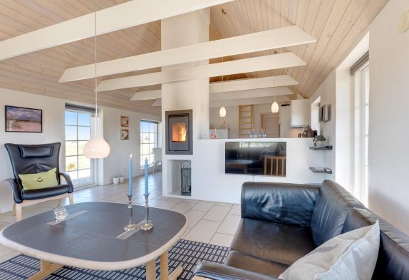 I dette lækre feriehus i Klegod er der ikke gået på kompromis med kvalitet eller udstyr. Der er loft til kip og synlige bjælker i køkkenet og i stuen, og den flotte brændeovnsindsats er både rumdeler og et godt supplement til varmen og hyggen i den kolde tid. De tre værelser er i en passende størrelse, og at der er to badeværelser, gør huset endnu mere attraktivt.