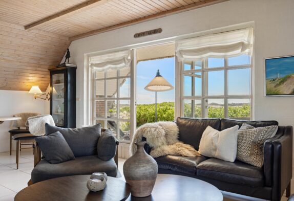 Både fra stuen og især fra den sydvendte terrasse er der en smuk og fantastisk panoramaudsigt over det smukke klitlandskab mod syd og mod vest. Her er det marehalmsklædte klitområde helt fredet, hvilket er et smukt syn og så er det samtidigt fredfyldt. At vågne op med åbent vindue i soveværelset er ubeskriveligt, bruset fra Vesterhavet høres, og vindens susen i marehalmen og den frisk luft i kombination er en skøn start på en feriedag.
