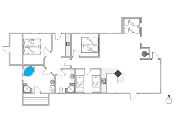 Sommerhuset har 3 soveværelser og en alkove i stuen, så der i alt er 8 sovepladser i huset. Alle soveværelserne har trægulv og lyse trævægge. 2 af værelserne har hver en dobbeltseng og på det sidste værelse er der 2 enkeltsenge. Der er 2 badeværelser i sommerhuset, begge har gulvvarme og en bruseniche. På det store badeværelse er der også en hjørnespa og en god sauna.