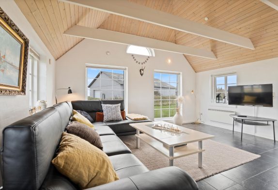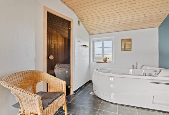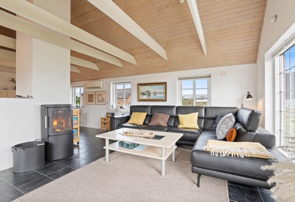 Derudover er der to gode badeværelser, hvoraf det store har både spa og sauna, så I virkelig kan slappe af og få ladt batterierne op. I stuen er der et flot træloft til kip og med synlige bjælker, som giver huset særlig karakter. På køligere dage kan I tænde op i husets brændeovn, som er centralt palceret i boligen.