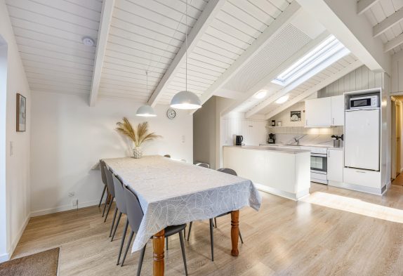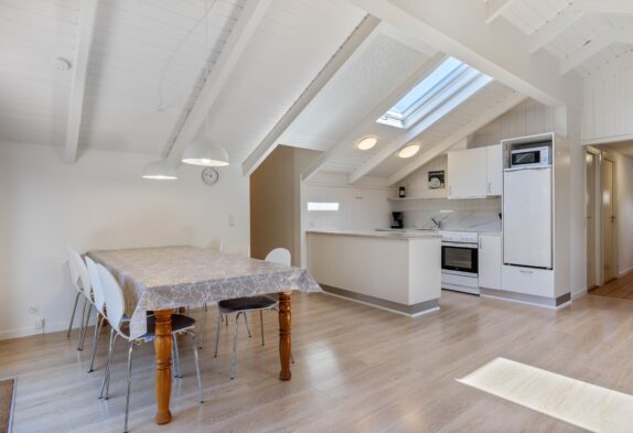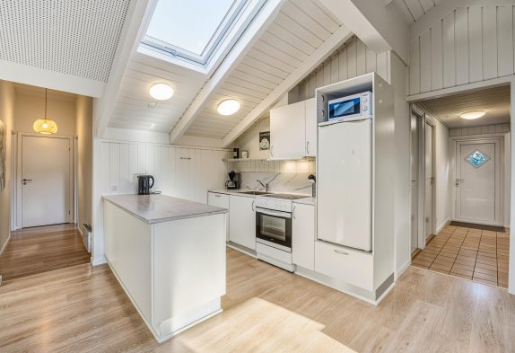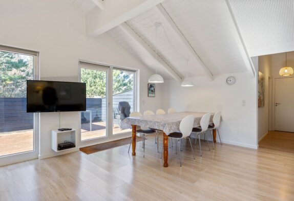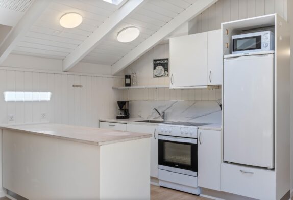 Feriehuset på Hvidbjergvej 9 har plads til 7 personer fordelt på 4 soveværelser. Her er 3 soveværelser med dobbeltsenge og et værelse med en enkeltseng, hvilket sikrer en god nats søvn for alle. Køkkenet står i åben forbindelse med stuen og er udstyret med mikroovn, opvaskemaskine og 100 liters separat fryser, så I nemt kan lave mad og opbevare jeres dagligvarer. Yderligere finder I både en vaskemaskine og en tørretumbler, så I kan tage jer af al praktisk vask.