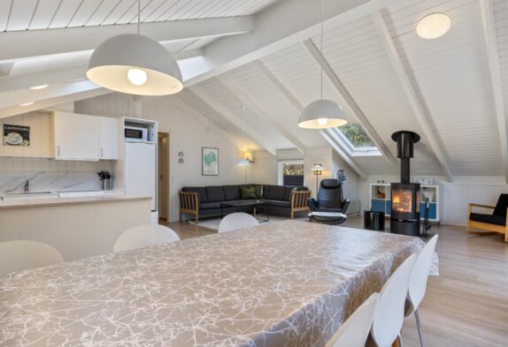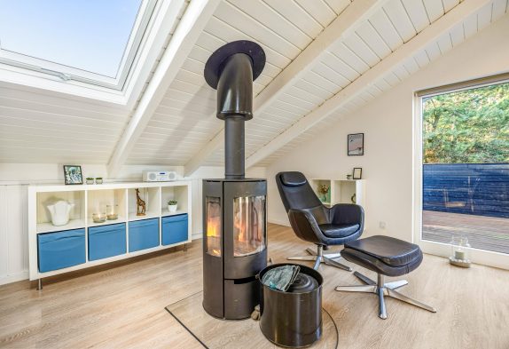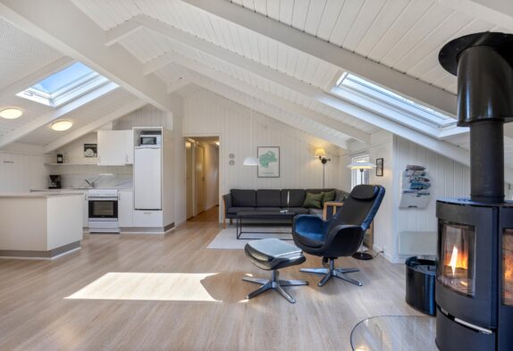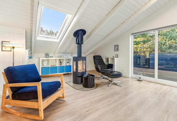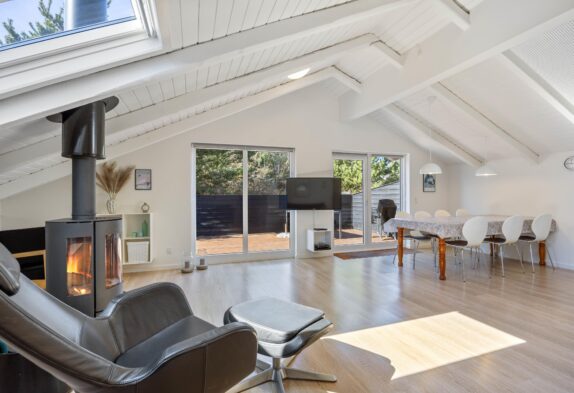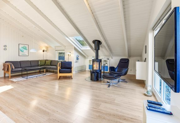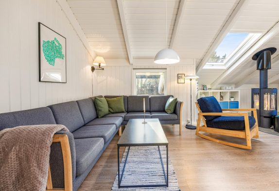 Sommerhuset hjerterum er helt sikkert den hyggelige stue, der er udstyret med komfortable møbler, brændeovn og fladskærm. Fra stuen er der udgang til vestvendt terrasse. Her er åbent til kip og godt lysindfald fra ovenlys vindue og terrasseparti. Den tidligere alkove i stuen er nu en hyggelig krog, perfekt til en afslappende dag med en bog foran brændeovnen. I sommerhuset er der også gratis trådløst internet, der sikrer at I altid kan følge med online om hvad der sker ude omkring i verdenen.