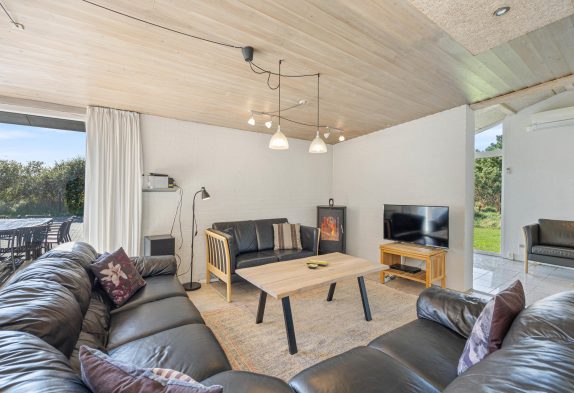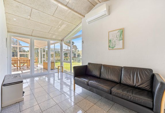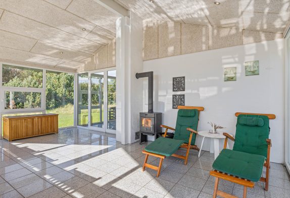 Sommerhuset har også en hel fantastisk havestue, så hvis vejret ikke viser sig fra sin allerbedste side, kan man nyde naturen og lyset i den flotte havestue. Der er vinduer næsten hele vejen rundt, så det føles som at være udenfor. Her er en hyggelig brændeovn så I kan nyde hyggen og varmen som en brændeovn spreder og et langbord til hele familien, der gør at I kan nyde en dejlig middag eller spilaften med jeres egne medbragte brætspil.
