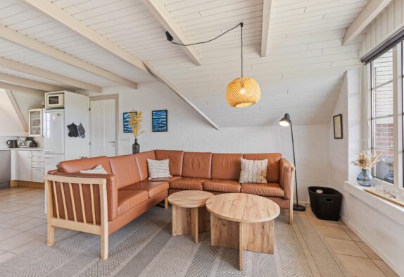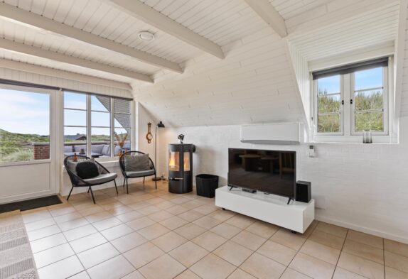 Dette velindrettede sommerhus i Søndervig byder på en skøn brændeovn, der sikrer hyggelige aftener i samvær med dem, I elsker. Sommerhuset har med sine 3 gode soveværelser plads til 6 personer. To af værelserne er med dobbeltsenge og det tredje med køjesenge til børnene. Sommerhuset har et dejligt, lyst badeværelse med gulvvarme, bruseniche og indgang til sauna. I den hyggeligt møblerede stue er der faste tæpper på gulvene og en dejlig brændeovn til kølige dage.